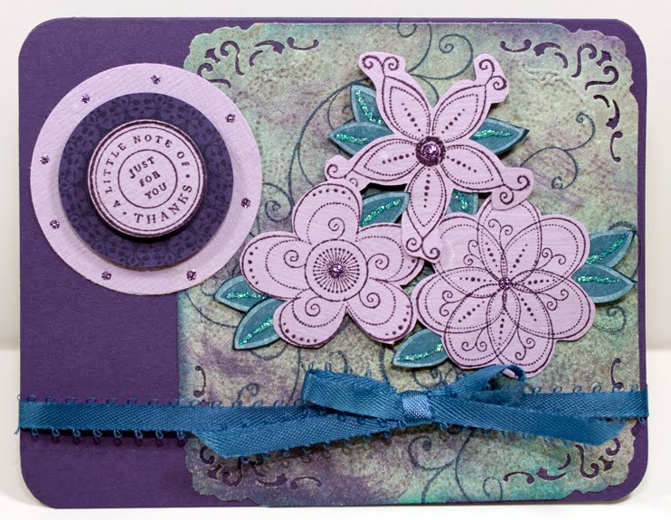 I am really enjoying my time spent in my craft room recently. Yesterday I spent a few hours in there making a Thank You card for a special relative who has been helping me with yard work while I am recovering from my surgery. This special family member LOVES the color purple, so I hope that she will enjoy her special card when she receives it.